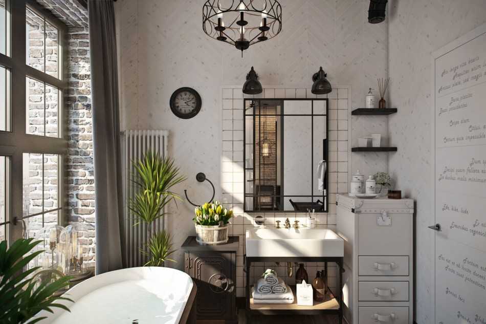 Индустриальный стиль, который был изначально создан для оформления чердачных помещений, в XXI в. остается по-прежнему модным. Главное достоинство лофта — отсутствие ограничений на использование творческих экспериментов при оформлении, что помогает придать ванной комнате оригинальность и стиль.
