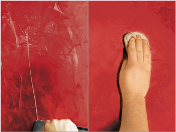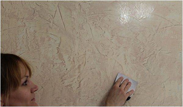 Состав кладут в один или несколько толстых слоев. Цвет завершающего слоя может совпадать с пигментом штукатурки. В результате оттенок станет насыщенным и равномерным.