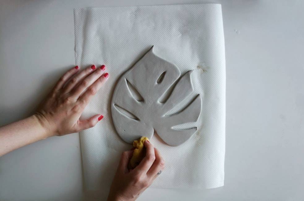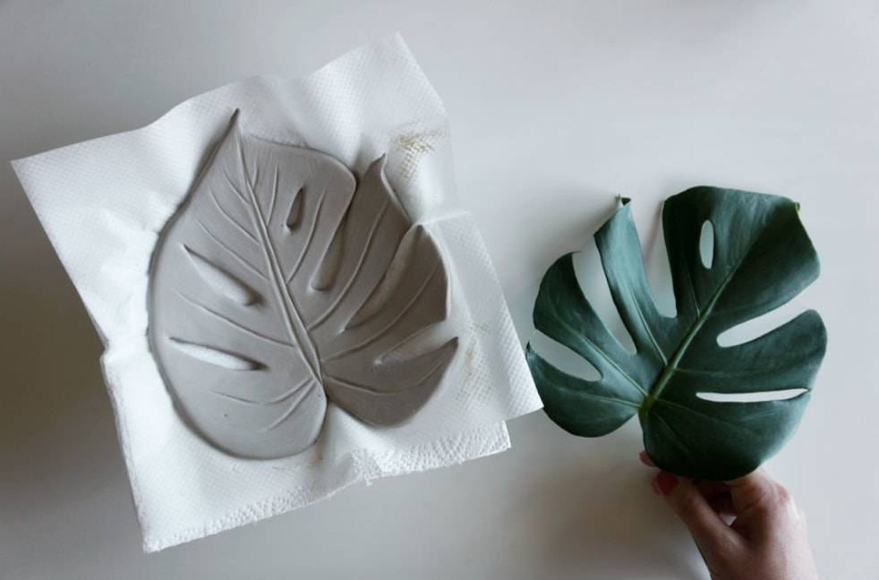 Кладем на глину лист монстеры и обводим контуры деревянной палочкой.