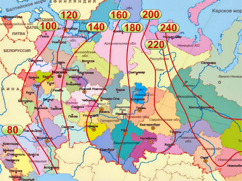 Карта глубины промерзания грунтов наглядно показывает как сильно отличается этот показатель в разных районах России. Чем сильнее может промерзнуть грунт, тем глубже должен быть заложен фундамент. Кроме промерзания на выбор фундамента также влияет склонность грунта к пучению при замораживании. Чем этот показатель выше, тем более ответсвенно нужно подходить к выбору и строительству фундамента