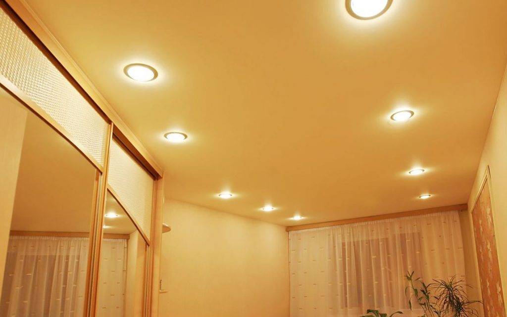 Использование встраиваемых или накладных точечных светильников для потолков в качестве основного освещения требует проведения расчетов по общим правилам. В среднем на 2м2 площади устанавливается источник света мощностью 35Вт. Если это будет дополнительное освещение, из общей мощности вычитаются показатели потолочной люстры.