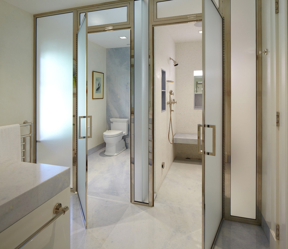 Начнем с того, что стекло бывает прозрачным и матовым. Очевидно, что именно матовые идеально подойдут для ванной или туалета.