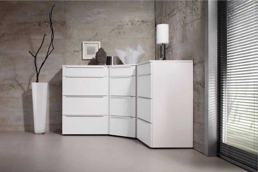 Угловой комод в гостиную в современном стиле отличается высокой функциональностью. Ящики, которые предусмотрены в нем, позволяют хранить различные вещи. Для небольшой комнаты угловая конструкция подходит лучше всего. Такие элементы мебели популярны в спальнях и детских комнатах.