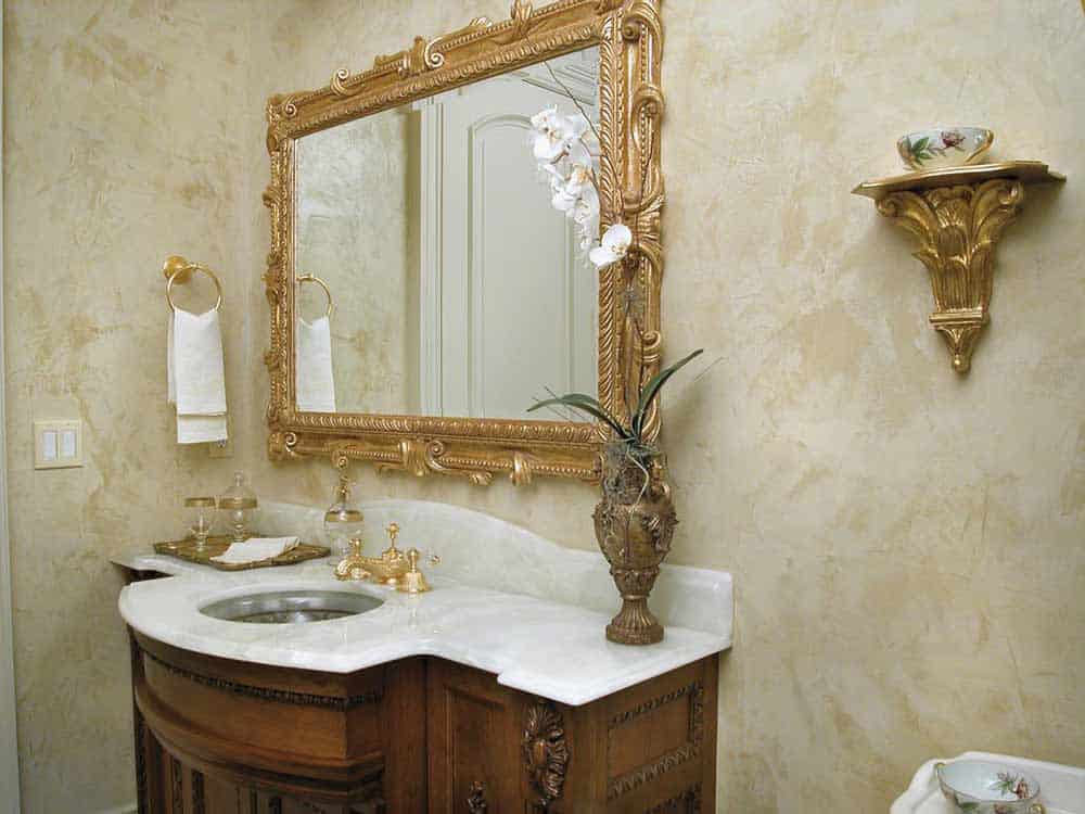 Венецианская штукатурка, предназначенная для ванной комнаты, представляет собой многослойное покрытие, которое способно визуально сделать помещение больше. Уютно и одновременно эффектно выглядит имитация оникса светло-желтого оттенка.