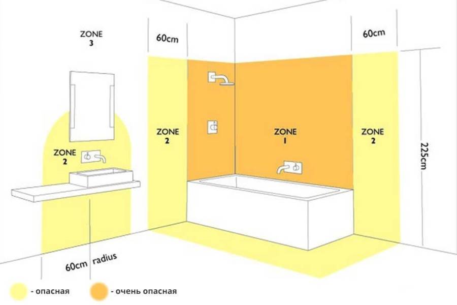 - Зона 1. Расположена непосредственно над душевым поддоном, ванной, умывальником или раковиной, на высоте 2,5 м от уровня пола.