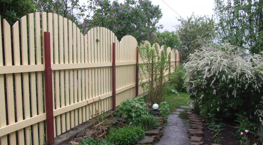 Сами секции забора совсем не обязательно должны быть прямоугольными, можно их фигурно «подрезать», используя профиль линий, который необходим вам по стилю.