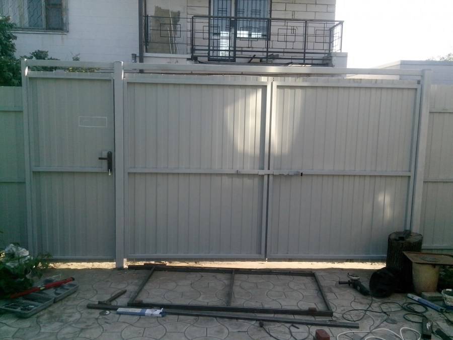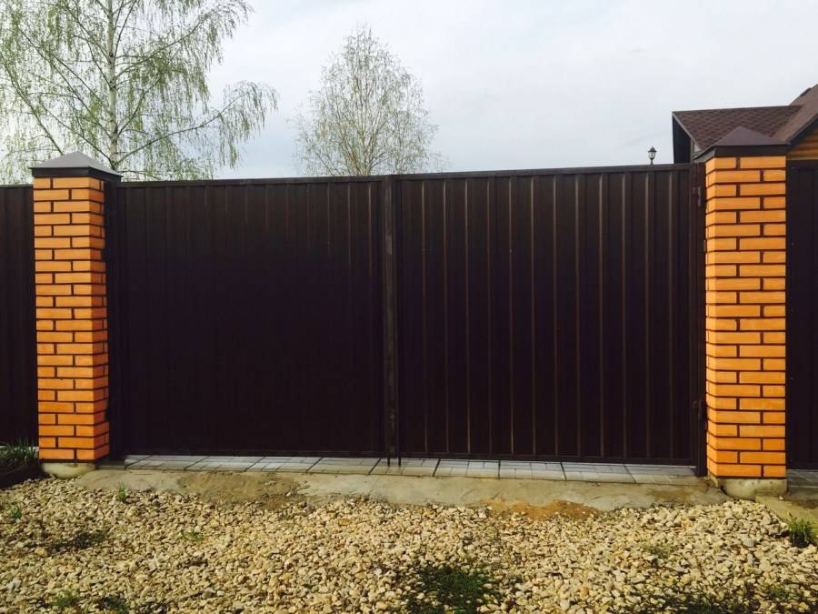 Но всё-таки достоинства распашной конструкции ворот с калиткой, приведённые на фото перечёркивают незначительные недостатки такого изделия. Тем более что проблемы не столь критичны и их, можно устранить в процессе проведения монтажных работ своими руками. А как стало известно из практики, ворота из профлиста являются самыми надёжными среди подобных конструкций.