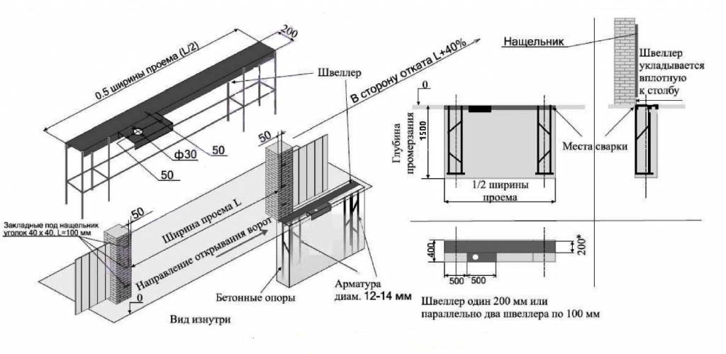 Чтобы конструкция прослужила длительный период, чаще всего закладывают швеллер. Он выступает своего рода фундаментом для опор и должен быть на том же уровне, что и поверхность почвы, чтобы транспорту было удобно заезжать.