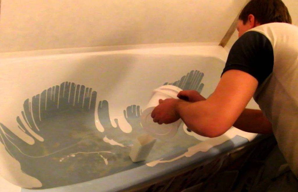 - Акриловые эмали наносят способом налива – приготовленный рабочий состав выливают на горизонтальные бортики ванной, откуда он равномерным слоем растекается по стенкам и дну чаши