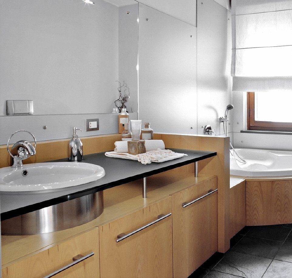 - Безвредные материалы. Возможно, не стоит гнаться за экологичностью, но всё же использовать в ванне мебель из ДСП стоит только в самом крайнем случае — воздействие тепла и пара может спровоцировать выделение вредных веществ из него.
