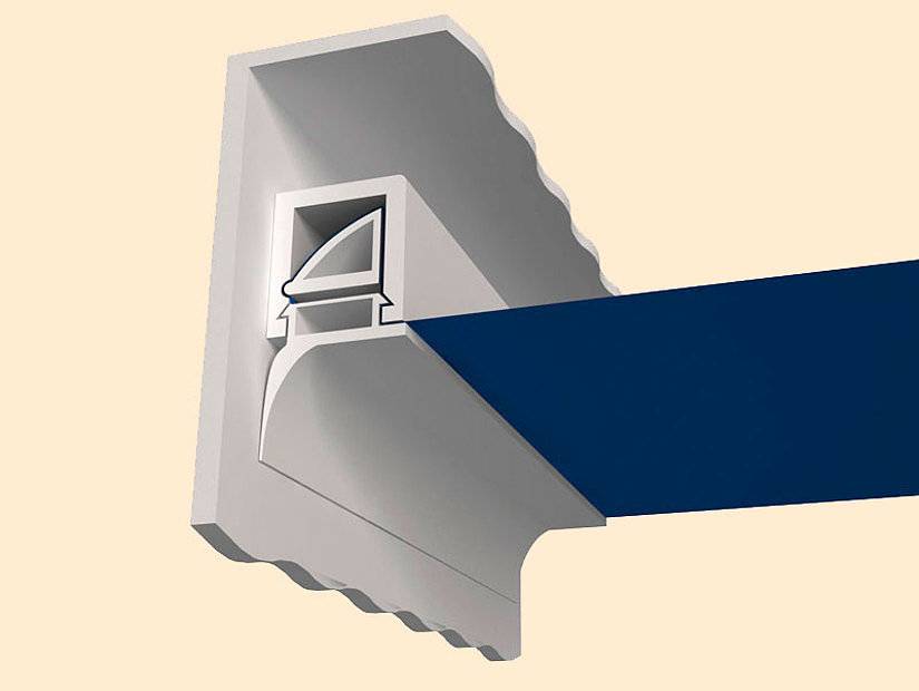 Лента для натяжного потолка заводится в паз самым длинным ребром, после чего хорошо прижимается руками на всем протяжении и разравнивается. Вставка устанавливается по периметру помещения вдоль стен. В углах ленту лучше не гнуть, а подрезать по 45 градусов с помощью стусла. При стыковке торцов двух лент на прямолинейном участке их подрезают строго под прямым углом.