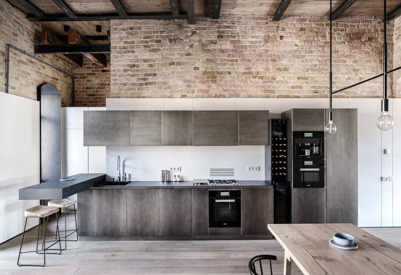 Кухня в стиле «лофт» чаще всего представляет собой большое открытое пространство. Для таких помещений характерна грубая отделка, имитирующая кирпичную кладку, наличие массивных вытяжек и больших окон.