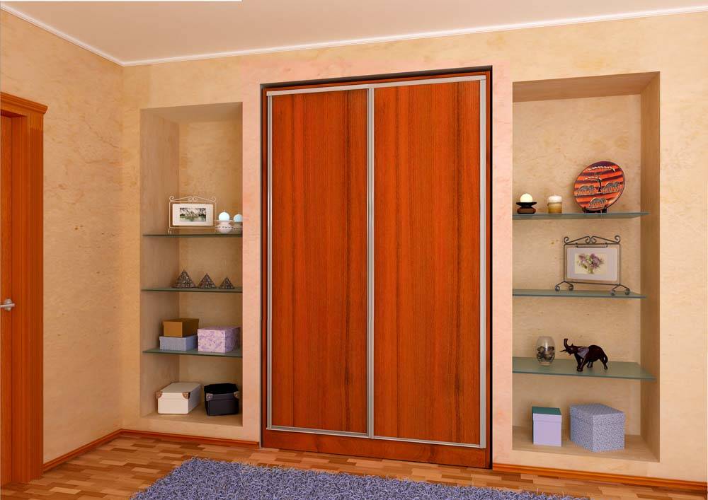 Иногда тип помещения предполагает нестандартное решение для установки шкафа. К примеру, для прихожей тупиковой или узкой формы лучше использовать встроенную конструкцию. Этот вариант экономичнее. Роль боковых и задней стенок в ней играют стены комнаты. Составляющие также закрепляются на них. В таких модулях отсутствует самостоятельный потолок и пол. Для изготовления встроенного шкафа-купе необходимы только двери, направляющие для них, прочная фурнитура, дополнительные конструкции, крепления.