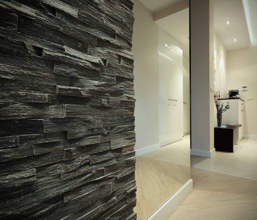 Декоративный камень на стене — это решение, которое часто используется в современном дизайне прихожей. Интересной идеей также является их сочетание с терракотой на полу. Залог успеха в этом случае — правильное сочетание цветов. Темный декоративный камень в коридоре будет отлично смотреться, если использовать один оттенок как для пола, так и для стен. Такое сочетание хорошо смотрится в просторных интерьерах — узкая прихожая с черным или темно-серым декоративным камнем может выглядеть даже меньше, чем есть на самом деле.