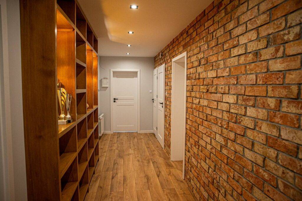 Не теряет своих позиций отделка декоративным кирпичом и штукатуркой, но она будет лучше смотреться в больших прихожих, где есть необходимость зонирования и можно не бояться, что отделочный материал «украдет» определённое количество пространства.