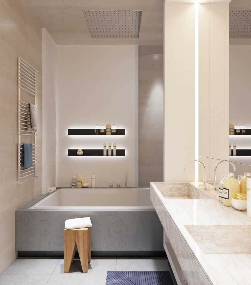 В случае если в ванной комнате планируется устроить дополнительную подсветку, то электропроводка создается на этапе проектирования и подготовки помещения. Для этого нужно укрепить направляющие из поликарбоната, оргстекла или ПЭТ и установить их на поверхности. Впоследствии на них крепится кафельная плитка с соблюдением зазоров в 3 – 4 мм, которые необходимы для сохранения рисунка на поверхности.