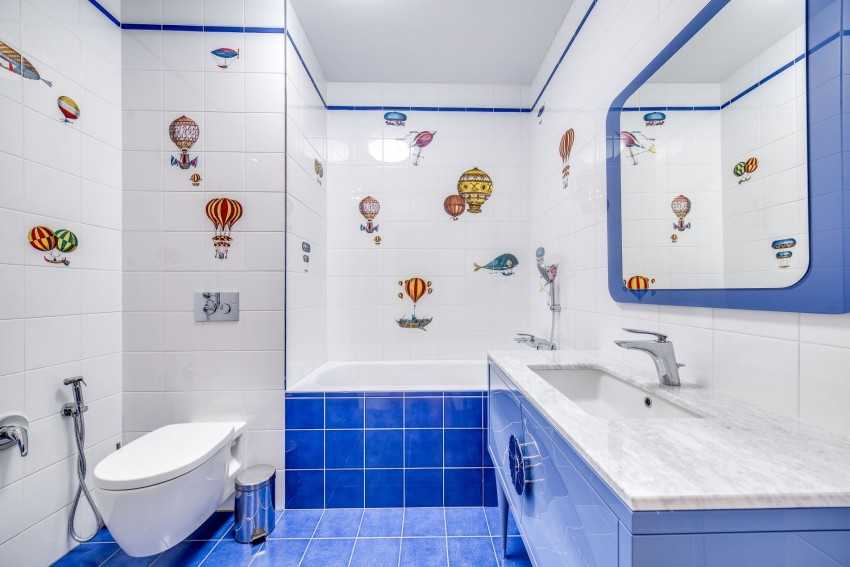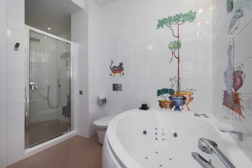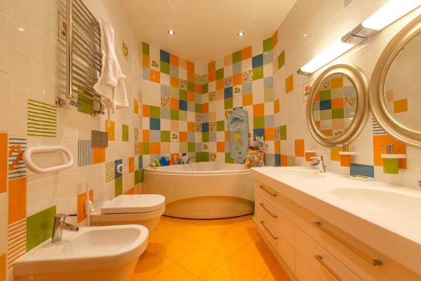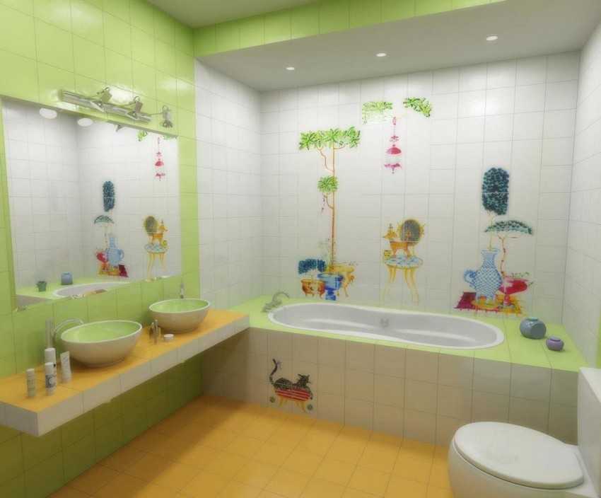 - брызги (актуально в больших ванных, где большая часть поверхности однотонна и в хаотичном порядке расположены «всполохи» другого цвета, как брызги);