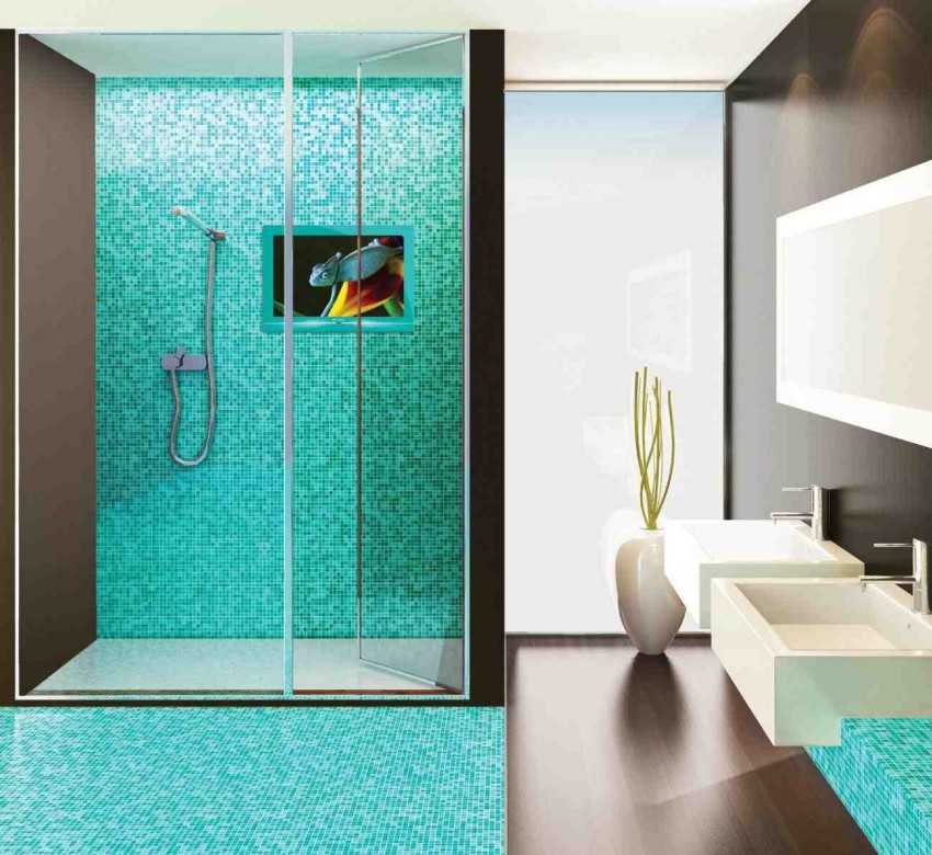 Помимо керамической плитки также доступна стеклянная плитка. Она бывает в виде мозаики, настенного декора или большого панно. Стеклянная плитка в основном используется для отделки стен и в качестве корпуса для сантехнических приборов. Чаще всего имеет глянцевую поверхность и ее легко содержать в чистоте. Плитка не впитывает воду, поэтому хорошо подходит для ванных комнат и кухонь. Высокое давление может повредить ее, поэтому стеклянную плитку на полах обычно не используют.