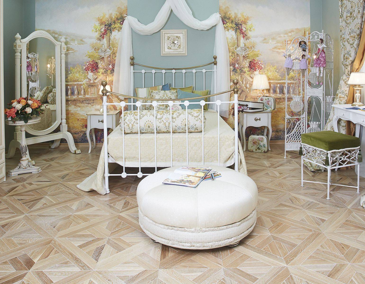 Правило этого стиля – много цветов не бывает, поэтому не стоит опасаться, если розы или другие цветочные узоры будут присутствовать и на шторах, и на постели, и на ковре. Комната должна стать воплощением нежности.