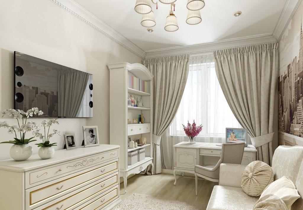 Изящная провансовская обстановка – отличный вариант для комнаты юной леди. Здесь уместны обои пастельных тонов с мелкими цветочными принтами. Такое оформление создаст уютную девичью обстановку и подчеркнет достоинства старинной деревянной мебели, выкрашенной белой краской.