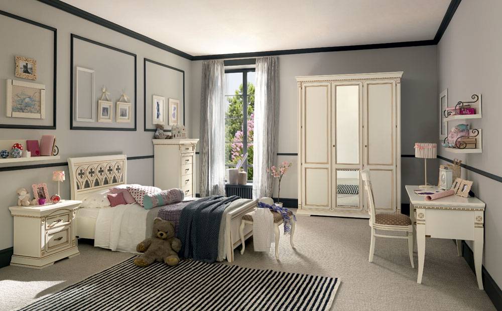 Мебель и все элементы декора должны быть очень нежными, плавными, немного воздушными; никакой агрессии или вычурности не допускается. Детская кроватка, столик и шкаф должны быть стилизованы под старину, поэтому дерево для такой мебели зачастую выбеливают, придавая ему налет потертости. Элементы старины добавят и резные ножки на мебели.