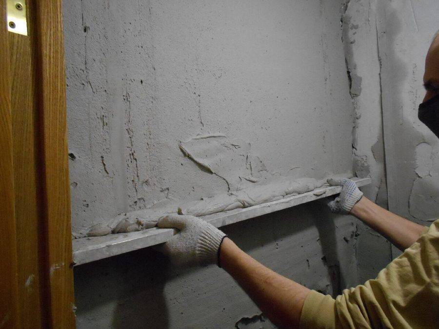 - Полностью очищаем стену от остатков предыдущей отделки, простукиваем поверхность на предмет наличия пустот. Если таковые имеются, отбиваем слабо держащуюся отделку, заделываем получившиеся ниши шпаклевкой.