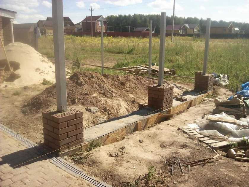 Не будем искать лёгких путей и рассмотрим сразу один из самых сложных вариантов, когда приходится иметь дело с очень пучинистым грунтом, но нужно поставить кирпичные столбики, а под профлистом организовать бетонный цоколь.
