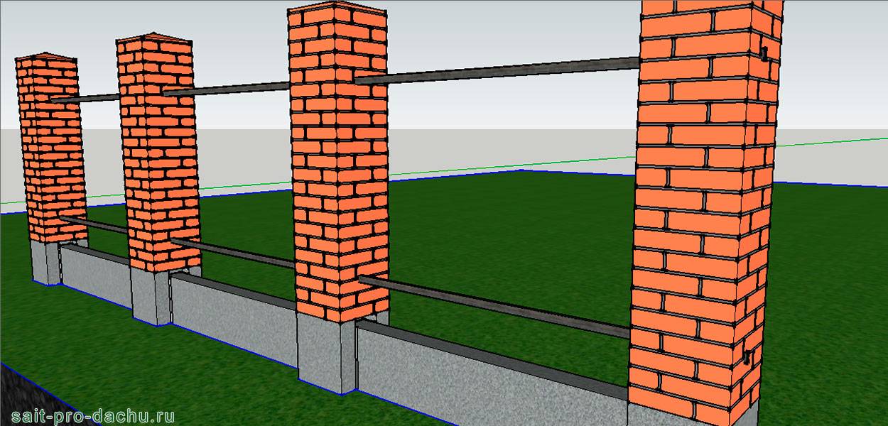 Схематическое изображение конструкции забора с кирпичными столбами Вся технология такая же, только армирование потребуется более жесткое — два пояса по два прутка диаметром 10-12 мм. В столбы необходимо будет установить закладные элементы, к которым будут крепится направляющие. Их (закладные) можно приварить к трубе, после того, как она выставлена и схватился раствор.