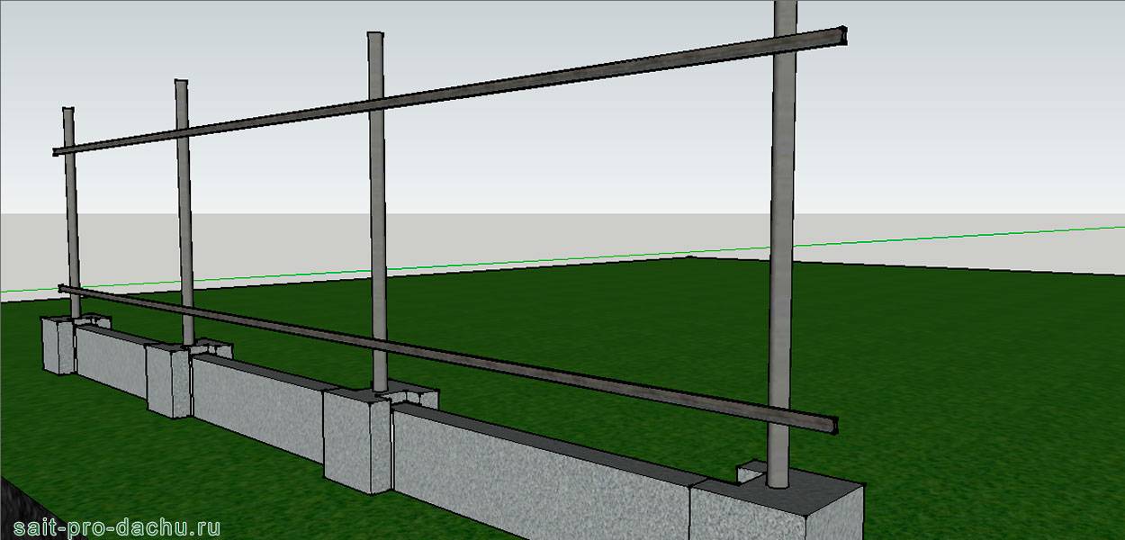 На подготовленные опоры уже можно крепить лаги и профлист. Изначально надо определиться с количеством перегородок, можно использовать 2, а можно и 3. Всё зависит от высоты забора.