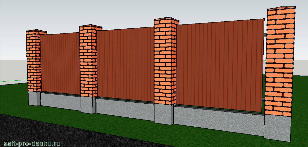 Профлист в сочетании со столбами из кирпича смотрится солидно Конечно, более декоративно выглядит ограждение с кирпичными столбами. При желании можно сделать и его, но времени потребуется больше. Есть два варианта: