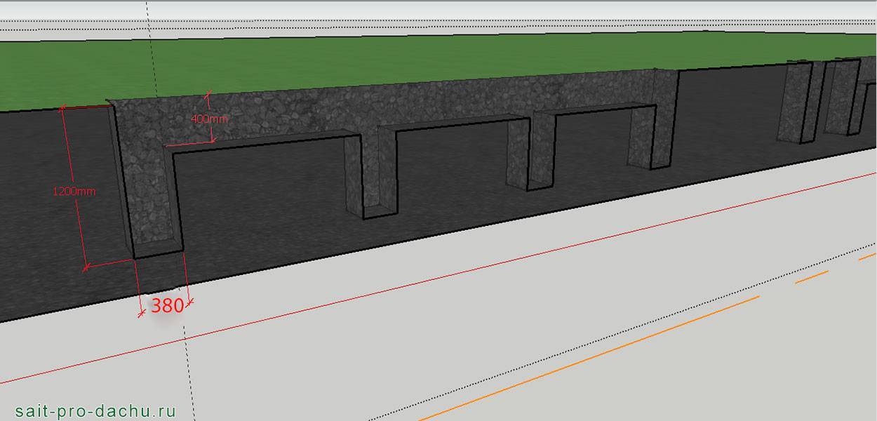 Дальше по тыльной стороне меток копаем ямки шириной не менее 380×380 мм и глубиной чуть ниже точки промерзания грунта, морозное пучение оно не только зданиям вредит, но и заборам. Углубления соединяем траншеей шириной в 160 мм и глубиной 400 мм. Копать можно и шире, но лишнее всё равно потом придётся засыпать.