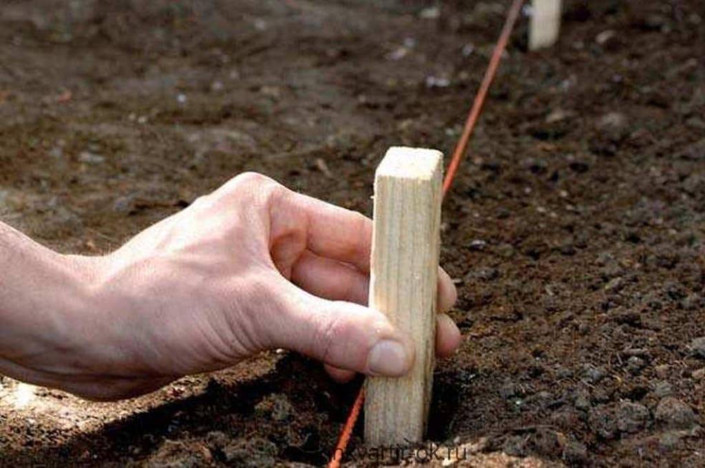 Разметка проста в исполнении своими руками — устанавливаем крайние арматурные колышки, натягиваем между ними бечевку и делаем отметки кольями на заданном расстоянии.