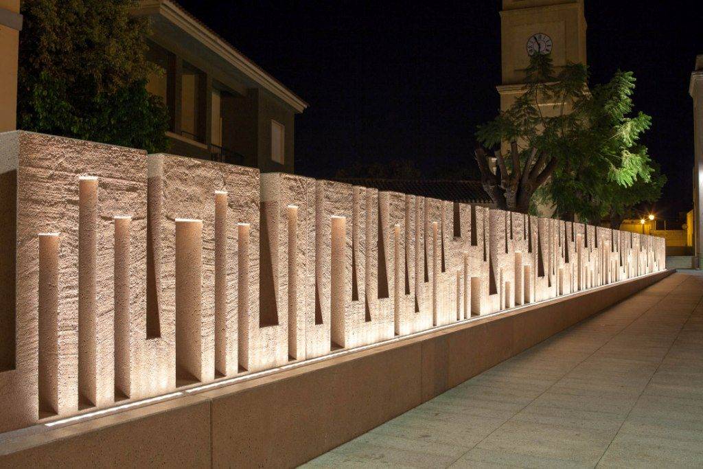 Фактуру оригинальной изгороди из резного песчаника можно подчеркнуть с помощью освещения, направленного снизу вверх.