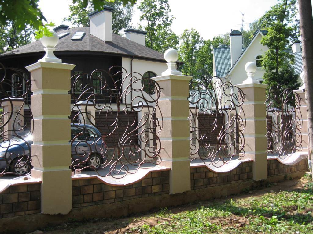 Изящные прутья кованой изгороди и ворот красиво сочетаются с кирпичными или каменными столбами.