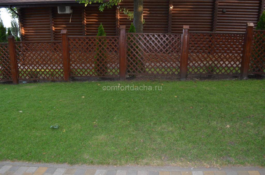 Другой вариант дырчатого ограждения — секционный забор в виде решетки из реек набитых по диагонали. Он хорошо смотрится в качестве ограды палисада перед частным домом.