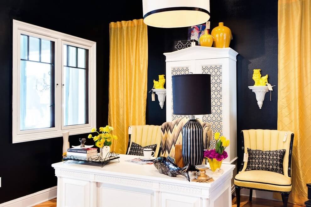 Черно-желтое сочетание с переходом в золотой традиционно для арт-деко или поп-арта в интерьере. Мрачность черных стен осветлит ярко-желтая мягкая мебель, люстра с золотым свечением.