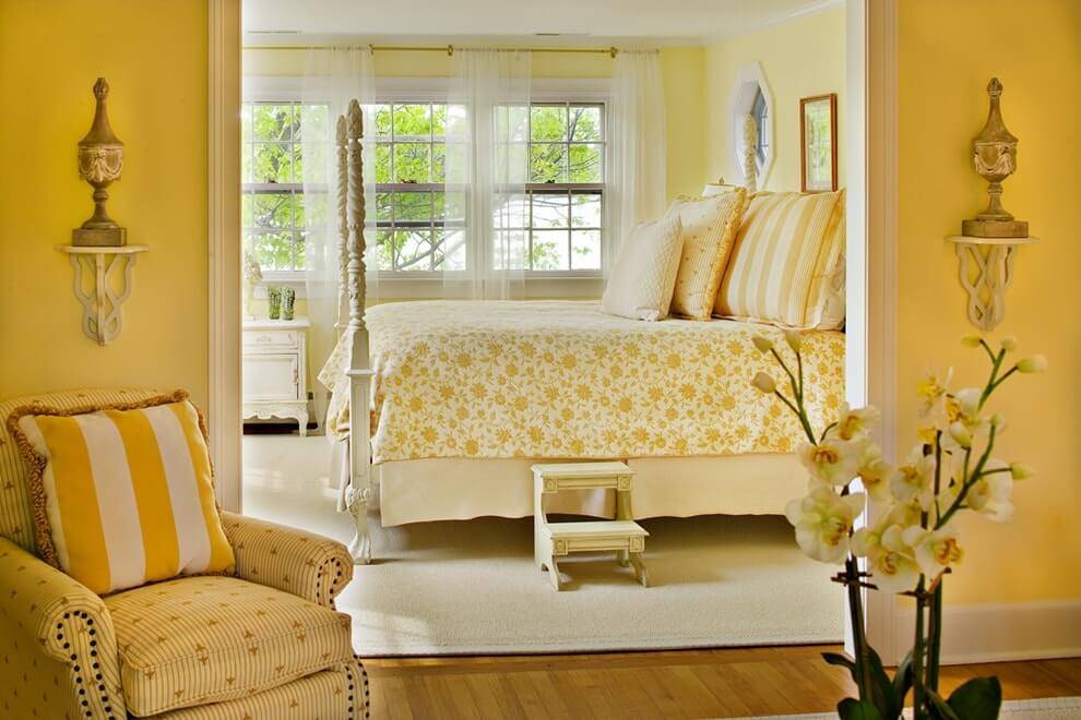 В спальне, где бал правит спокойствие, многие сочтут применение ярких цветов неуместным. С другой стороны, именно здесь мы пробуждаемся по утрам, и заряд бодрости, особенно для людей-«сов», крайне важен. Насыщенно-желтые обои в интерьере будут лишними, а вот отдельные яркие пятна (ваза, настенное панно, постельный текстиль) дадут необходимый стимул и энергию.