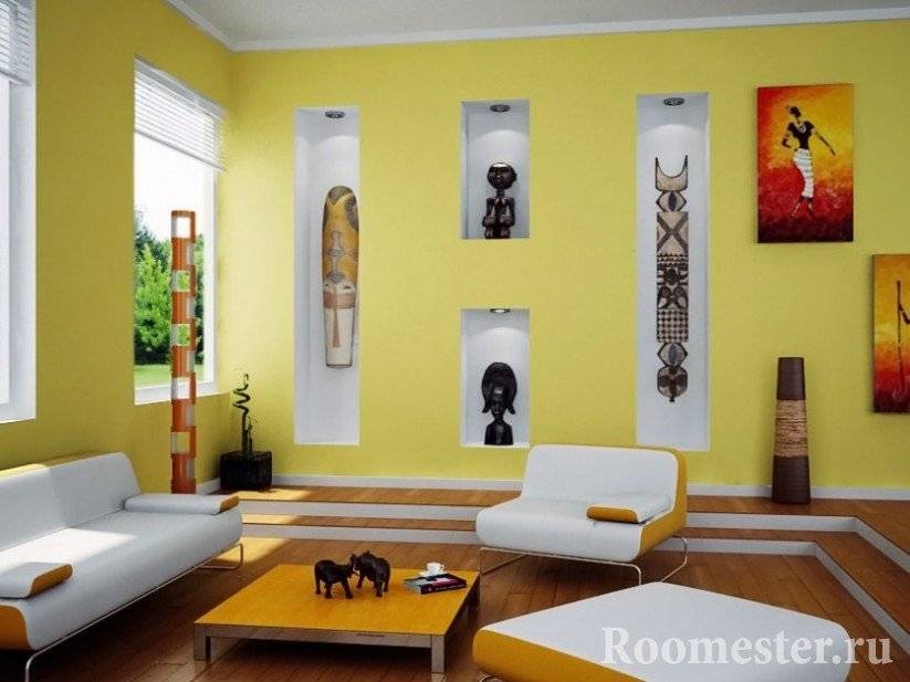 Желтый цвет ассоциируется с залитой солнцем пустыней и бескрайней саванной. В пару к нему можно взять коричневы, бежевый, черный цвет. Яркими акцентами будут анималистичные принты (коврик а-ля зебра), деревянные статуэтки-идолы, африканские маски. Можно поэкспериментировать и покрасить в желтый цвет не стены, а потолок или пол.