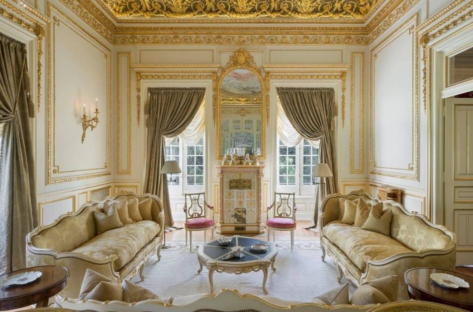 Роскошное зеркало на всю перегородку с подсветкой по всему периметру в классическом интерьере