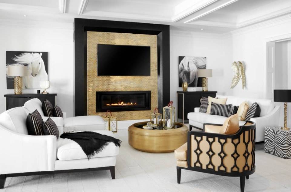 Не менее оригинальным и привлекательным решением станет оформление интерьера в сочетании золота с чёрным цветом. И в этом случае чёрного должно быть преобладающее количество. Чёрно-золотистый дизайн всегда будет выглядеть стильно и соответствовать моде, поскольку чёрный подчёркивает строгость, власть и современность, а золото ассоциируется с роскошью и богатством. Подобные дизайнерские идеи строятся на контрастах, поэтому следует дополнительно использовать и другие оттенки, которые помогут сгладить «углы» и резкие переходы между основным сочетанием цветов. Среди актуальных примеров различные комбинации светлых стен с тёмным полом либо чёрные предметы мебели с золотистым декором.
