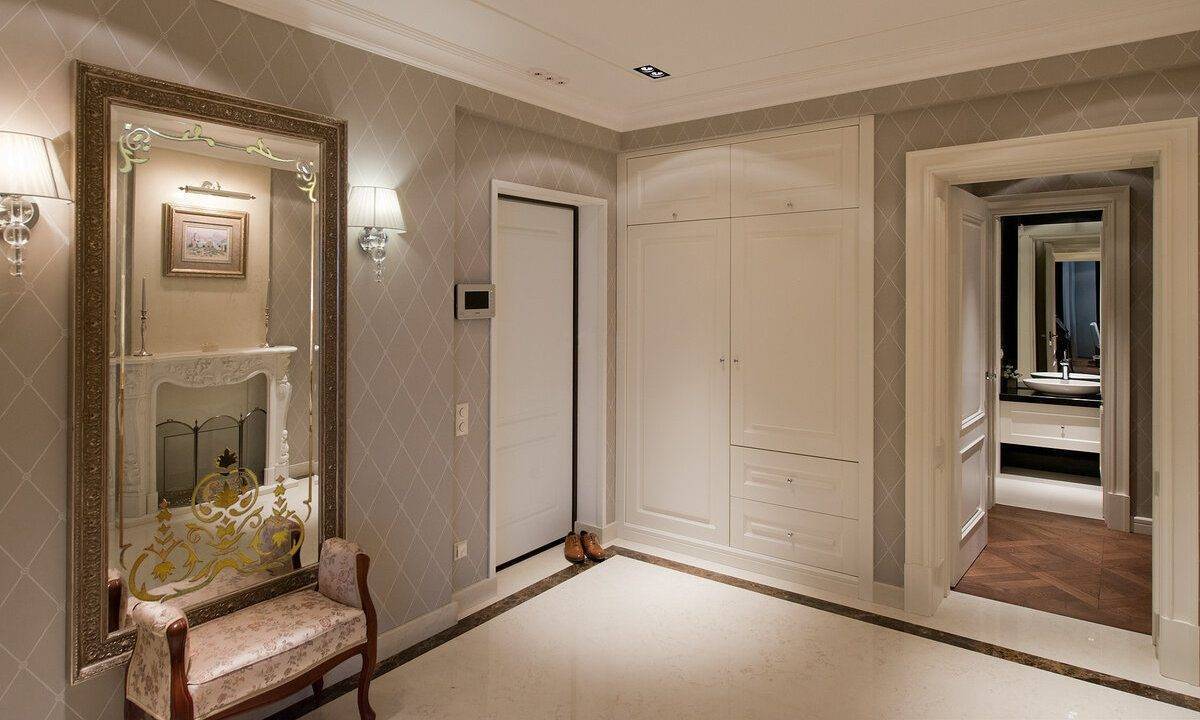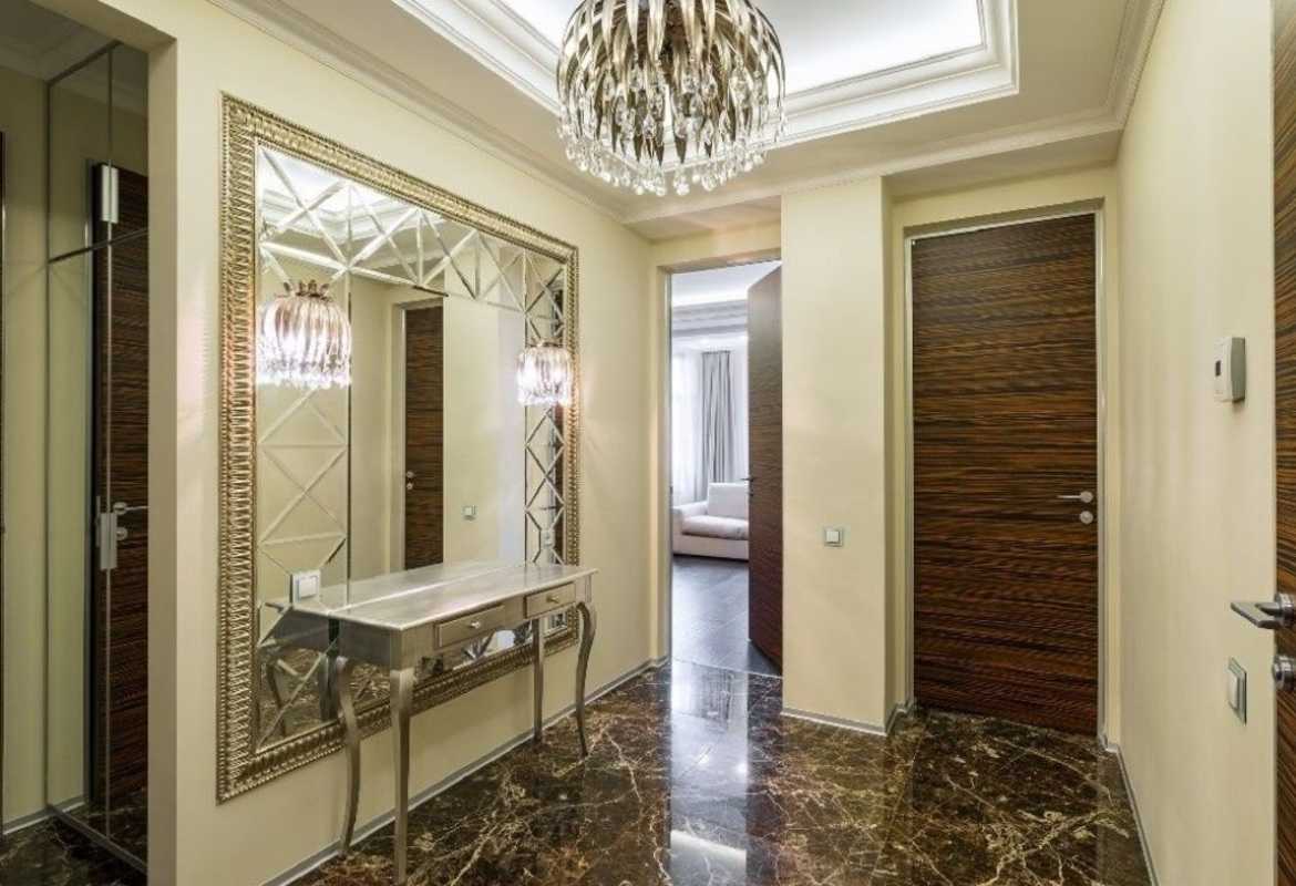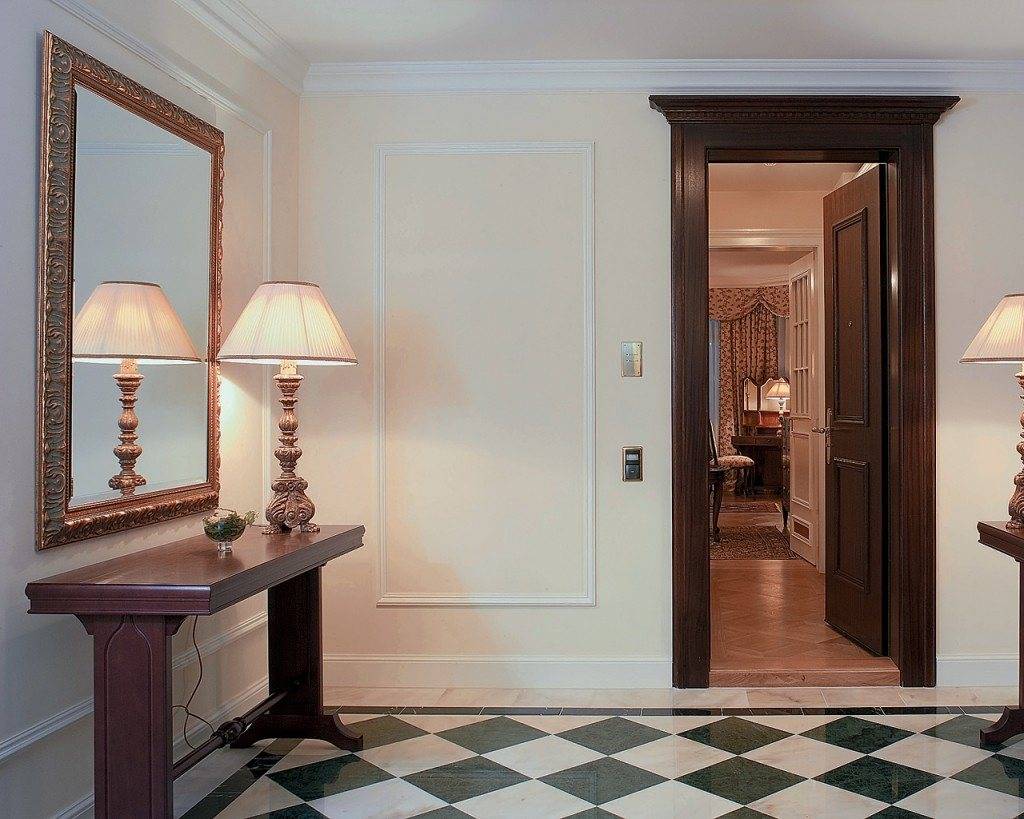 Отделка из кусочков матированного или состаренного зеркала создаст атмосферу солидной роскоши в прихожей классического стиля. Такой же эффект можно получить, используя для рамы дерево дорогих сортов или золочение.