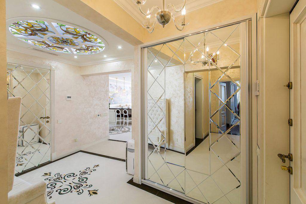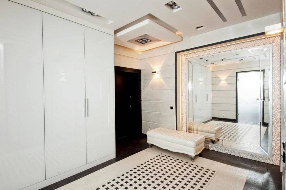 В прихожей желательно повесить открытое зеркало, которое всегда доступно и хорошо освещено. В крайнем случае можно закрепить его на входной двери. Допускается использование зеркальных потолков, колонн или створок шкафа-купе.