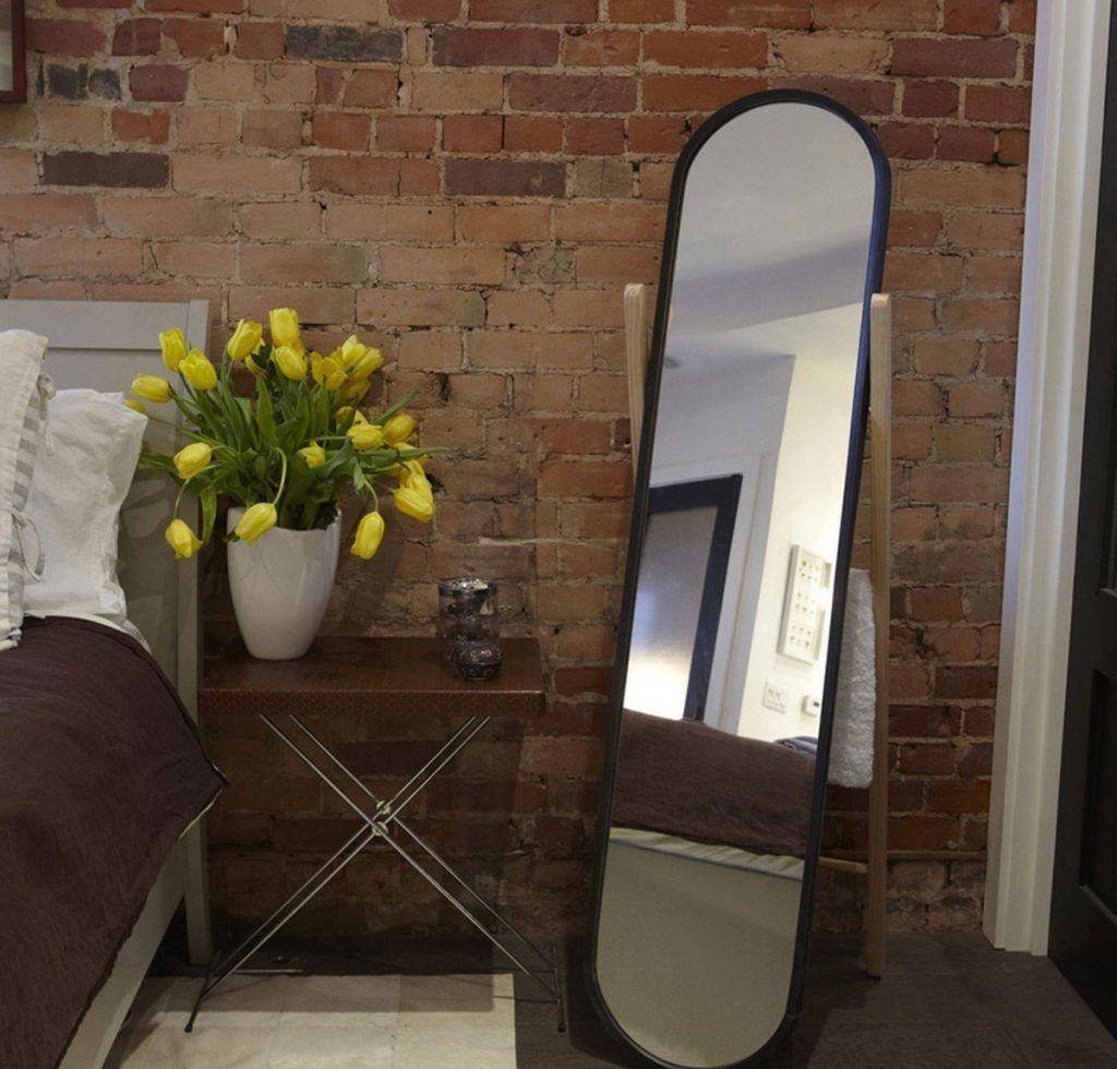 Рама для напольного зеркала обязательна, ведь оно должно быть устойчивым. Более того, особая конструкция стойки позволяет подобрать индивидуальный угол наклона отражающего полотна. Таким образом, человек получает возможность рассмотреть себя с любого удобного ракурса. Даже секции трюмо не дают такого преимущества. Что касается форм, то напольные модели принято делать прямоугольными или овальными.
