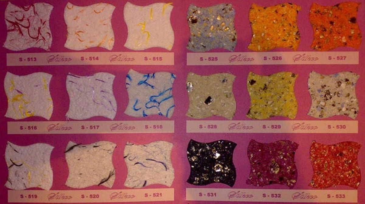 Обои, содержащие основным компонентом кусочки бумаги, не отличаются долговечностью, и не устойчиво к механическому воздействию. Цена их гораздо меньше, чем у шелковых. Кроме цены плюсом отмечается легкость ремонта испорченных участков. Удалить поврежденный участок легко, промыв его губкой, а далее его можно заменить, покрыв это место новым составом.