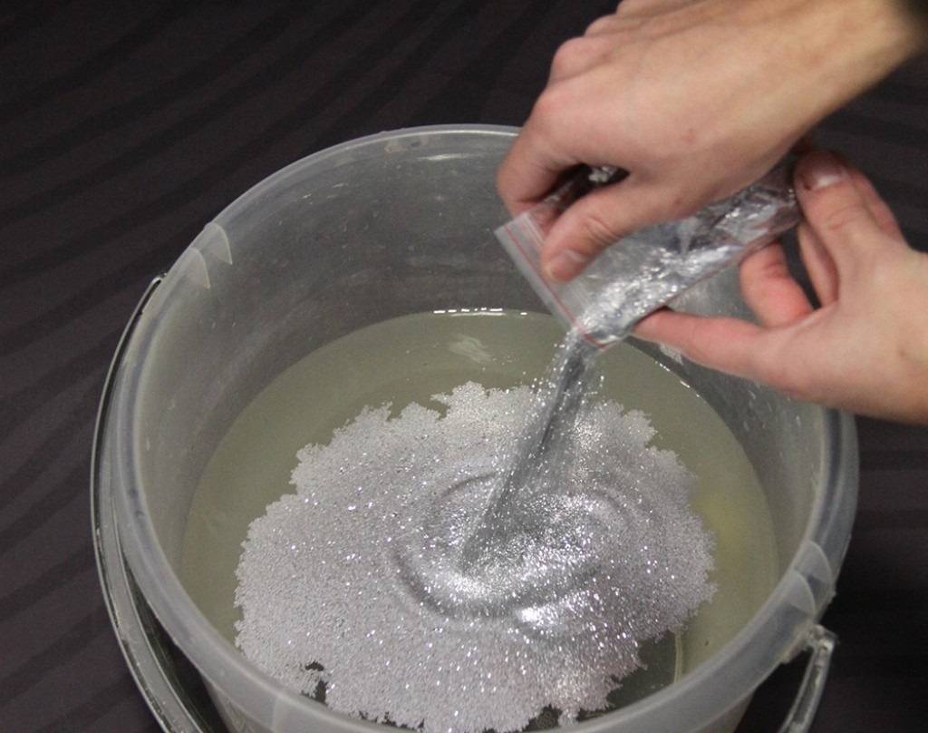 Чтобы не было заметных переходов и стыков, желательно сразу подготовить необходимое количество материала. Смесь продаётся упаковками в 1 кг, на каждой указывается, на какую площадь этого хватает (3-6 квадратных метров, в зависимости от состава и производителя).