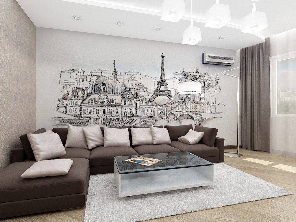 Модный вид помещения с перегородками, если прямо на перегородку нанести рисунок, это может быть даже печать рисунка и использование трафарета, а если есть навыки рисования, тогда используется простой карандаш для создания картины на стене. Вариант, как на фото выше, дополняется диван и комнату в целом. Подключая фантазию можно сделать рисунок в виде денежного дерева, на стену используя подручный материал или родовое, семейное дерево.