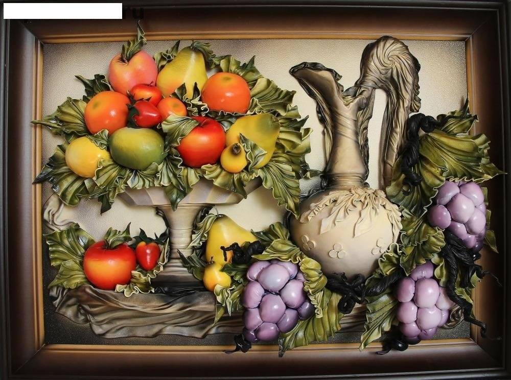 Готовый настенный барельеф тщательно ошкуривают наждачной бумагой, очищают все впадины и швы от пыли, грунтуют специальной кистью и окрашивают. Хорошо подходит водоэмульсионная краска, которой покрывают все выступающие части. Здесь лучше воспользоваться обычной губкой.