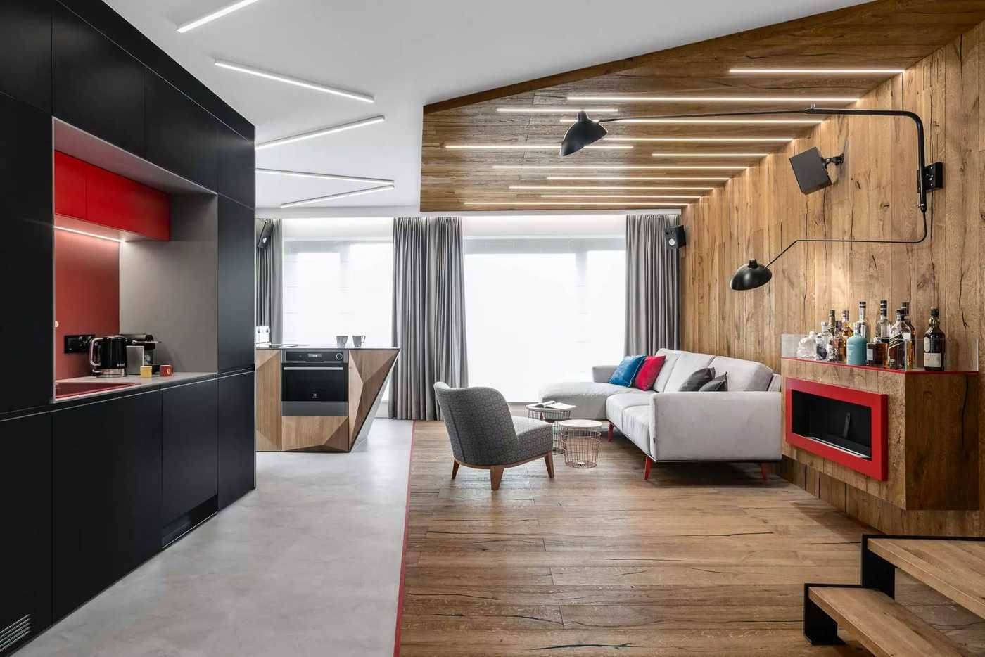 В современном интерьере комнаты, гостиная часть полностью отделана деревом. Пол потолок и стены оформлены деревянными декоративными досками, таким образом образован отдельный самостоятельный блок комнаты, который явно выделяется. Однако, чтобы не «разрывать» интерьер, дизайнер решил установить в гостиной белый диван, таким образом две части комнаты перекликаются друг с другом по цвету.
