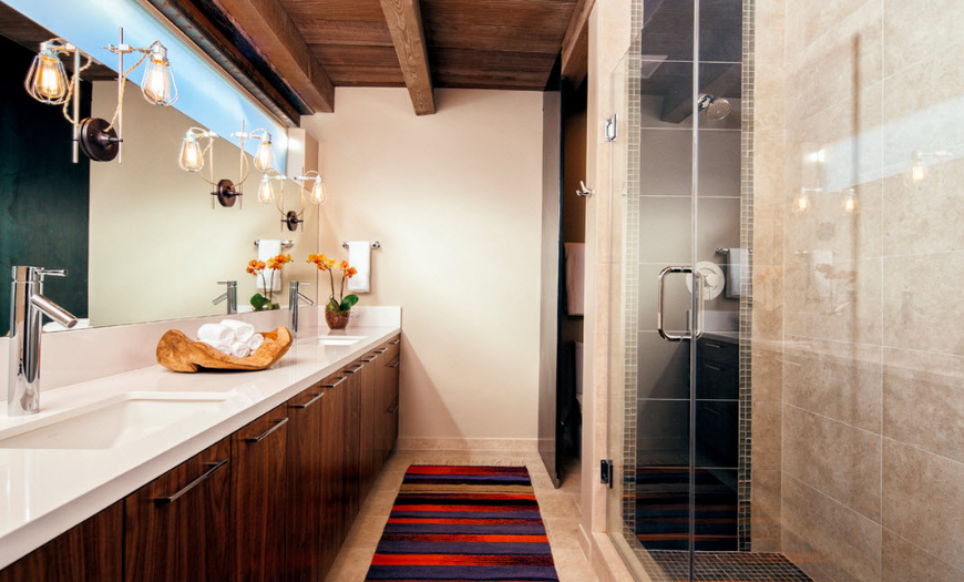 Этнические геометрические украшения, размещенные на бежевом фоне, не «кричат», а очень красноречиво свидетельствуют об исключительной природе пространства. Так же, как оригинальная раковина и отдельно стоящая ванна. Плетеные и деревянные аксессуары придают комнате уютный домашний характер.