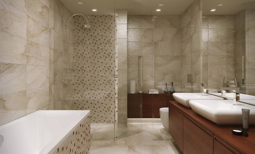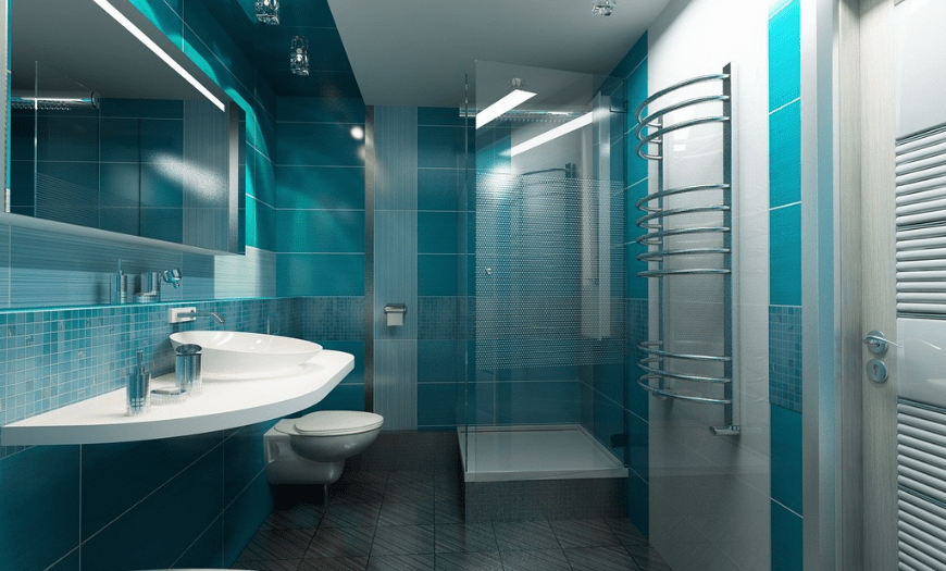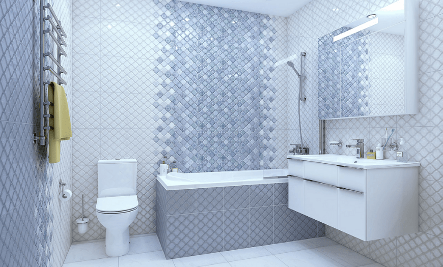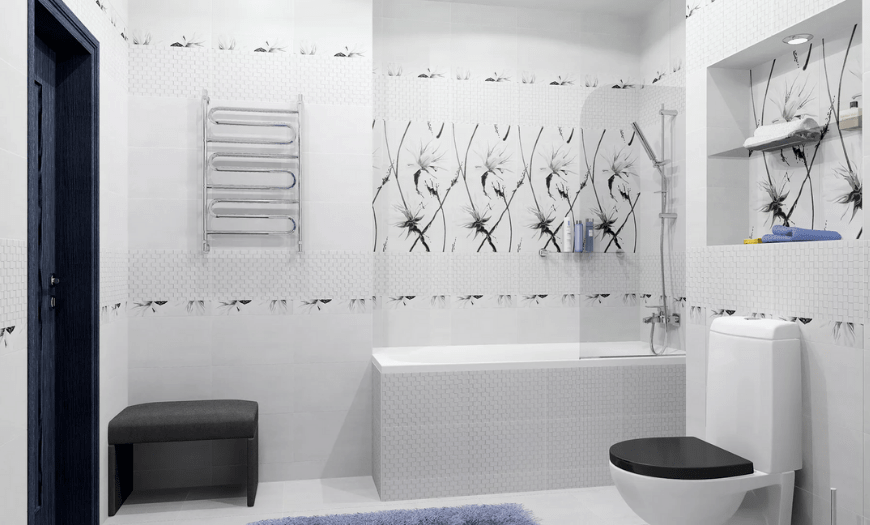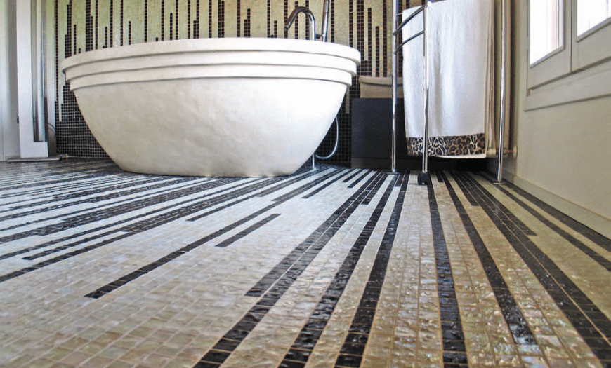 Мозаика в отделке, а также вертикальные полосы плитки способны увеличить помещение визуально, горизонтальные – наоборот.